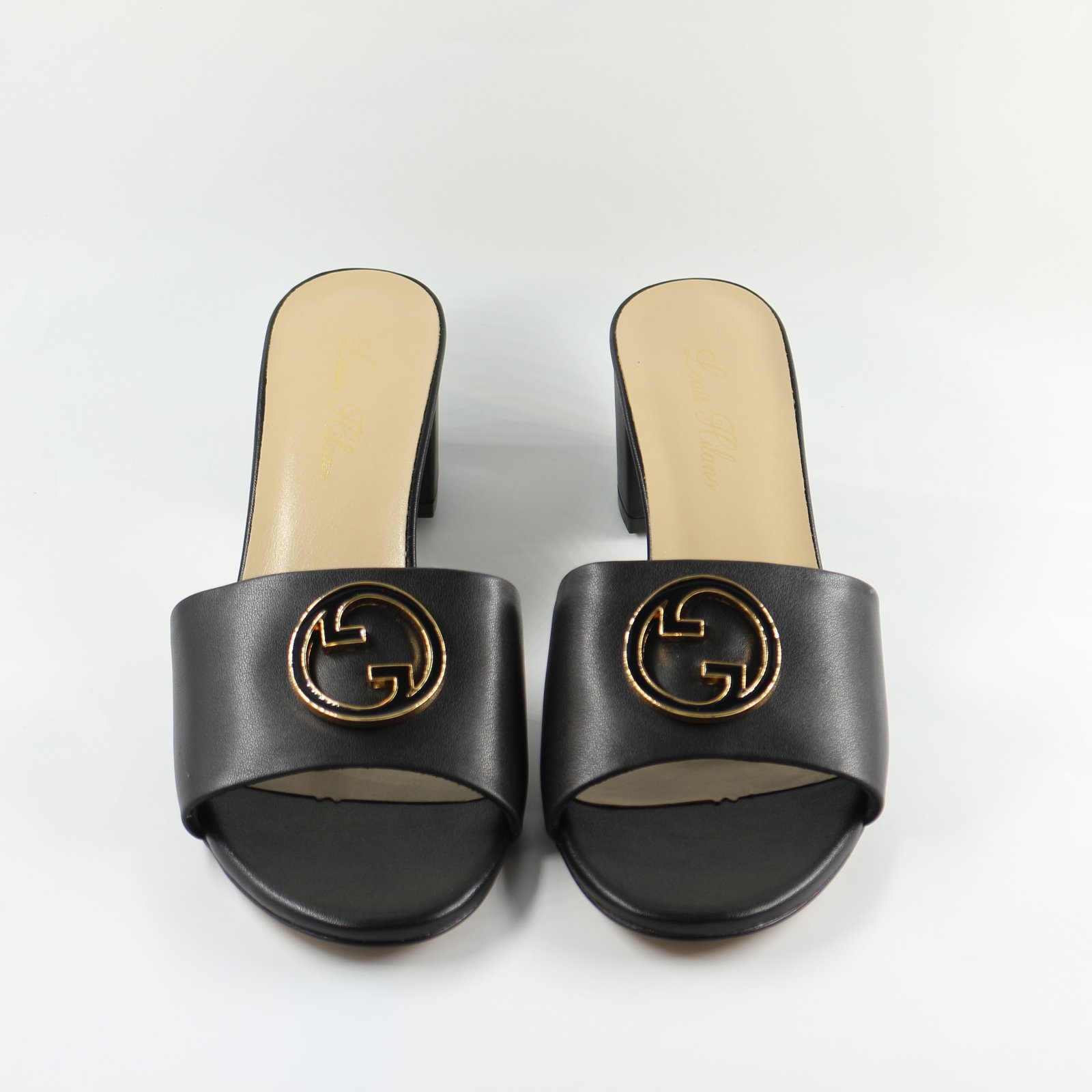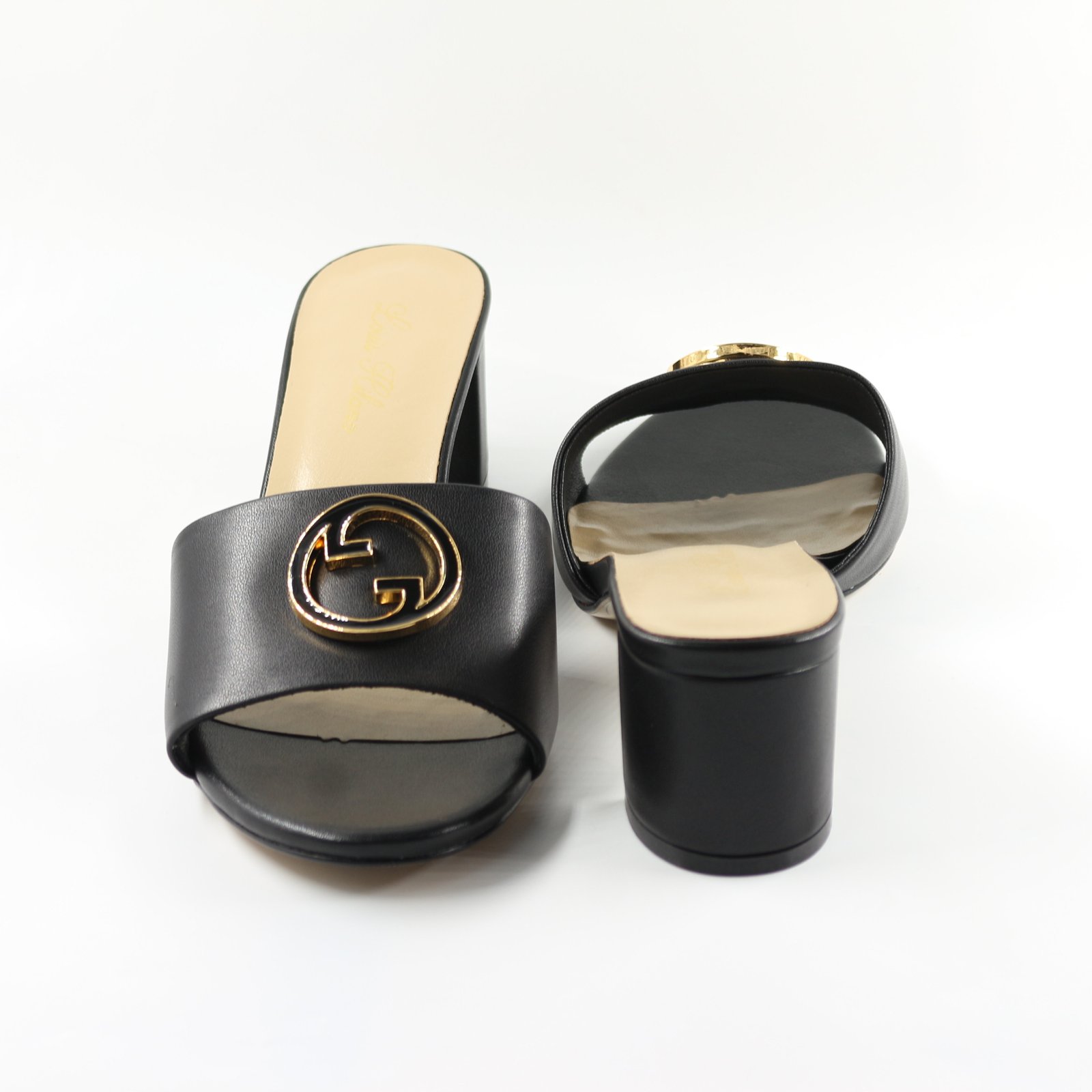 Wear these stylish black block heel sandals to exude elegance. They are the ideal combination of comfort and style for both dressy and casual ensembles. They are made of smooth leather and adorned with a striking gold emblem.