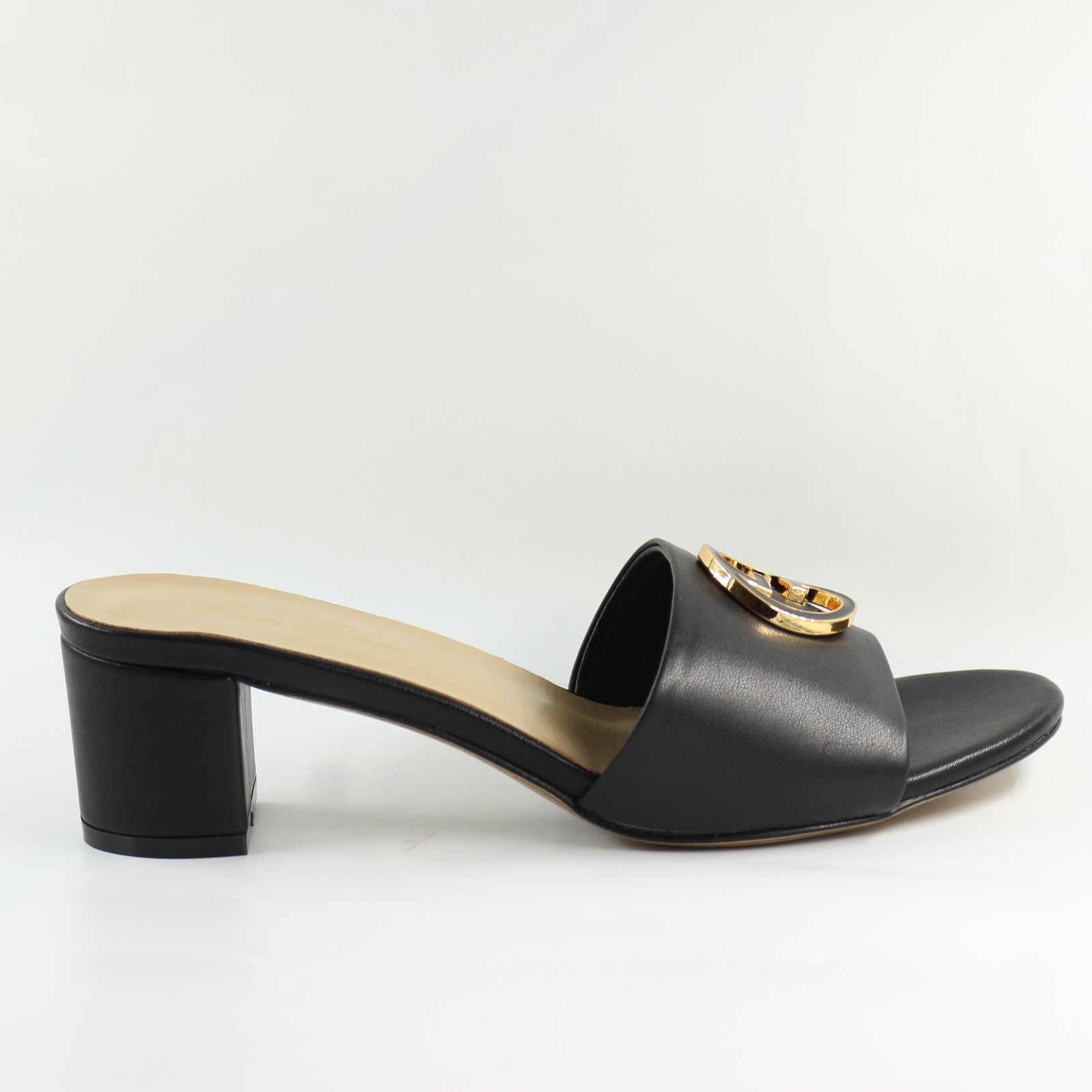 Black Leather Block Heel Sandal with Gold Accent